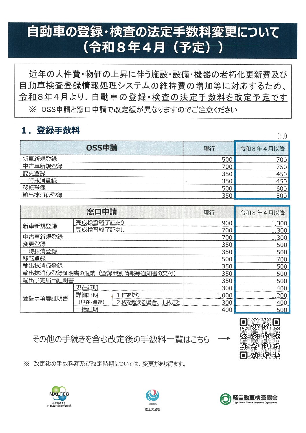 自動車の登録・検査の手数料が令和8年4月より、また改定されます。